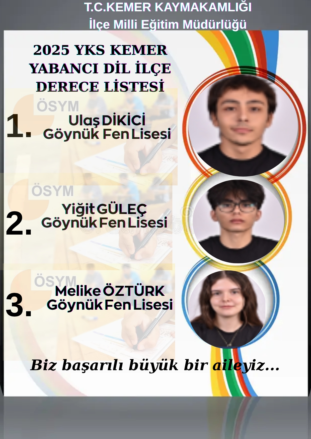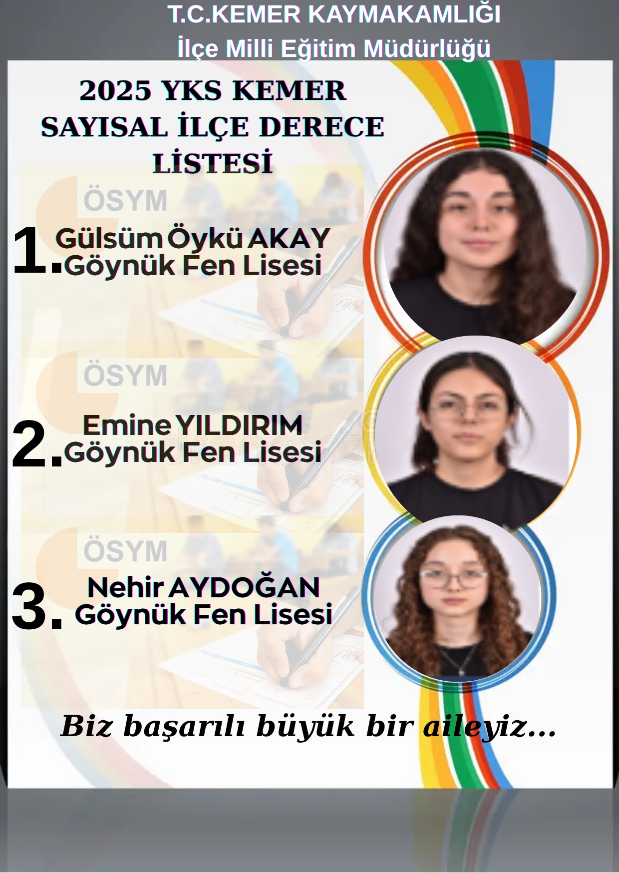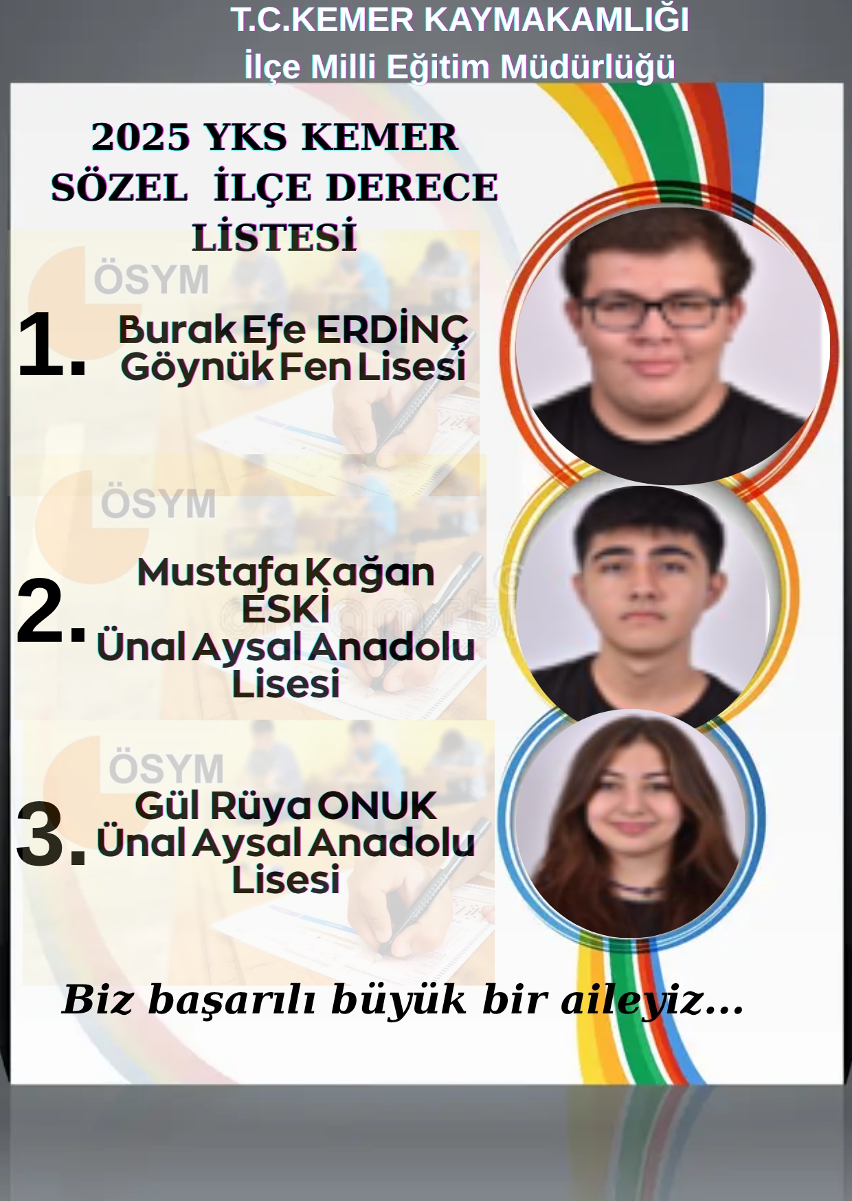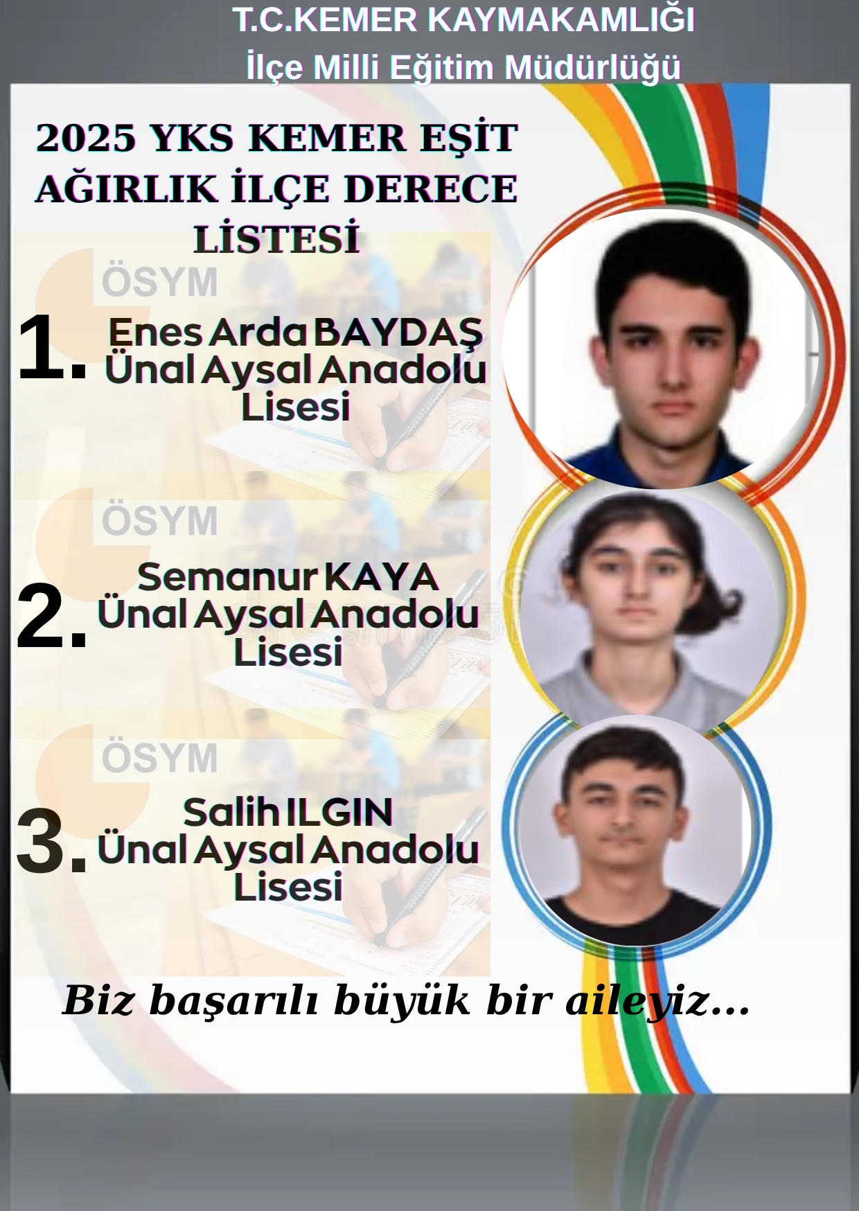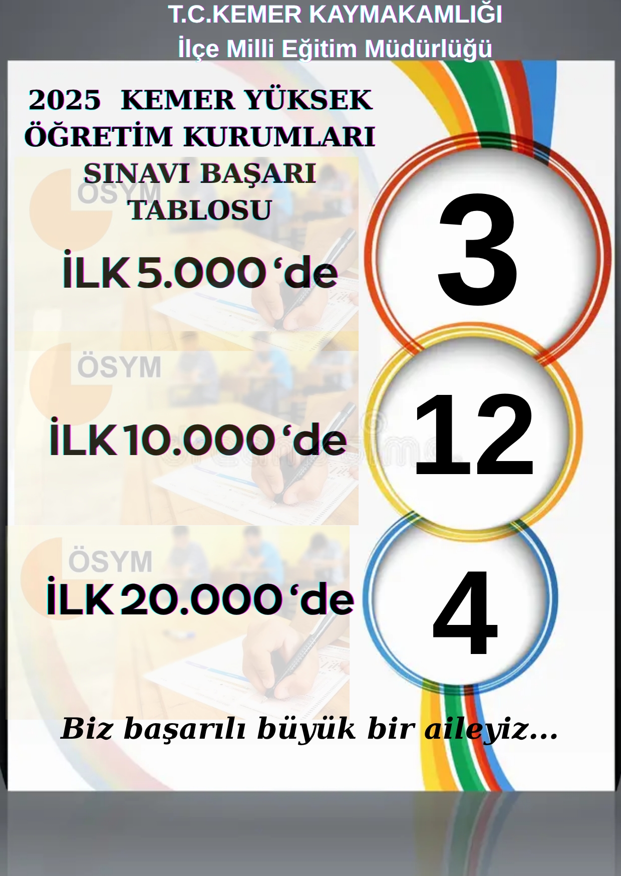 İlçe Milli Eğitim Müdürümüz Mehmet Erkan ERGEN "ÖSYM 2025 Yüksek Öğretim Kurumları Sınavları (TYT)Temel Yeterlilik ve (AYT) Alan Yeterlilik Sınavlarına ilçemizdeki 7 Liseden 12. sınıfta okuyan toplam 425 öğrenci katıldı.Bu öğrencilerimizden elliikisi(52) çeşitli puan türlerinde Türkiye Geneli 50.000 başarı sırasına girdi.Böylece hedeflerine ulaştıracak yüksek puanlar almış oldular.Şöyle ki; Sayısal puan türünde 14 öğrencimiz bu dilimde yer alarak Tıp Fakültesi,Diş hekimliği Fakültesi ve Eczacılık Fakültesi gibi yüksek puanlı fakültelere yerleşebilme imkanına kavuştu.
