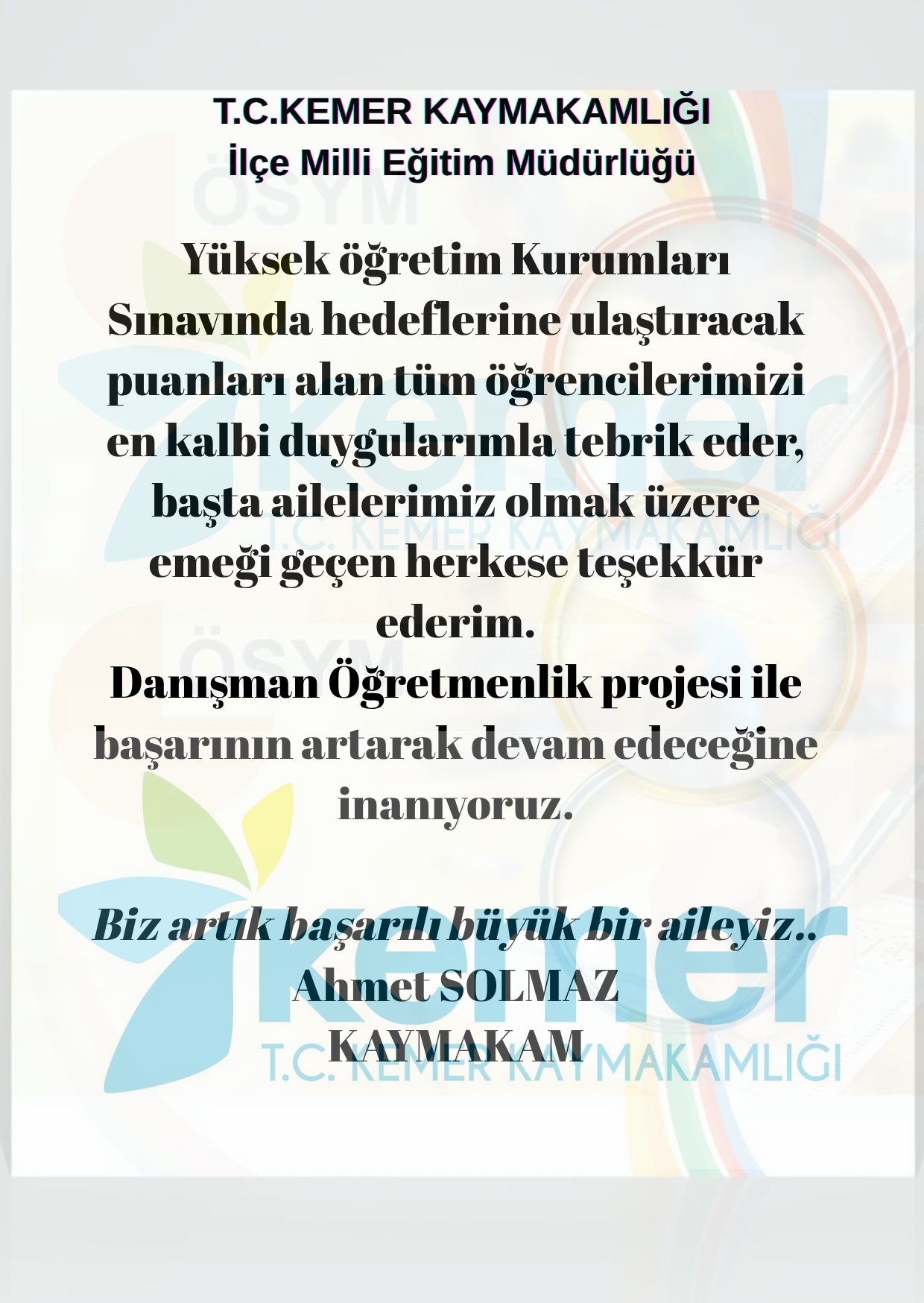 Eşit Ağırlık Puan türüne göre 32 öğrencimiz de Hukuk Fakültesi için öngörülen 100.000 Başarı sırasına girerek bu alanda yerleşme imkanına sahip oldu.Dolayısyla en çok tercih edilen ve yüksek puanlar ile öğrenci alan Üniversite ve Fakültelere yerleşebilecek öğrencilerimiz doğru tercih yaparak yüksek öğretim kariyerlerine başlayabileceklerdir.Buna mükabil ÖSYM'nin baraj koyduğu diğer alanlar Mühendislik fakülteleri ve Eğitim Fakültelerine başvurabilme koşulu olarak 300.000 barajına ulaşan öğrenci sayımız ise 108 olmuştur.Kaymakamımız Sayın Ahmet SOLMAZ'ın önceki yıllarda başlattığı "Danışman Öğretmenlik Projesi" kapsamında 2024-2025 eğitim öğretim yılı içinde İlçemizde Türkiye Geneli YKS-TYT ve AYT deneme serileri gerçekleştirildi.Deneme sonuçları Sayın Kaymakamımızın Başkanlığında analiz edilerek güncel yol haritası belirlendi.Kaymakamımız ayrıca Öğrenciler ve öğretmenler ile bir araya gelerek talep,ihtiyaç,dilek ve temnileri yerinde aldı.Milli Eğitim camiamıza ve bizlere güç katan Sayın Kaymakamımıza şükranlarımızı sunarız. Tüm öğrencilerimize yüksek öğretim ve hayat boyunca; sağlık, başarı ve güzellikler dileriz.2025-2026 eğitim öğretim yılında daha çok öğrencimizi üst öğretime ve hayallerine kavuşturmak için tüm okul ve kurumlarımızda başta Öğrencilerimiz olmak üzere,okul müdürlüklerimiz,öğretmenlerimiz,velilerimiz ve tüm paydaşlarımızla etkili ve verimli çalışmayı temenni ederiz."